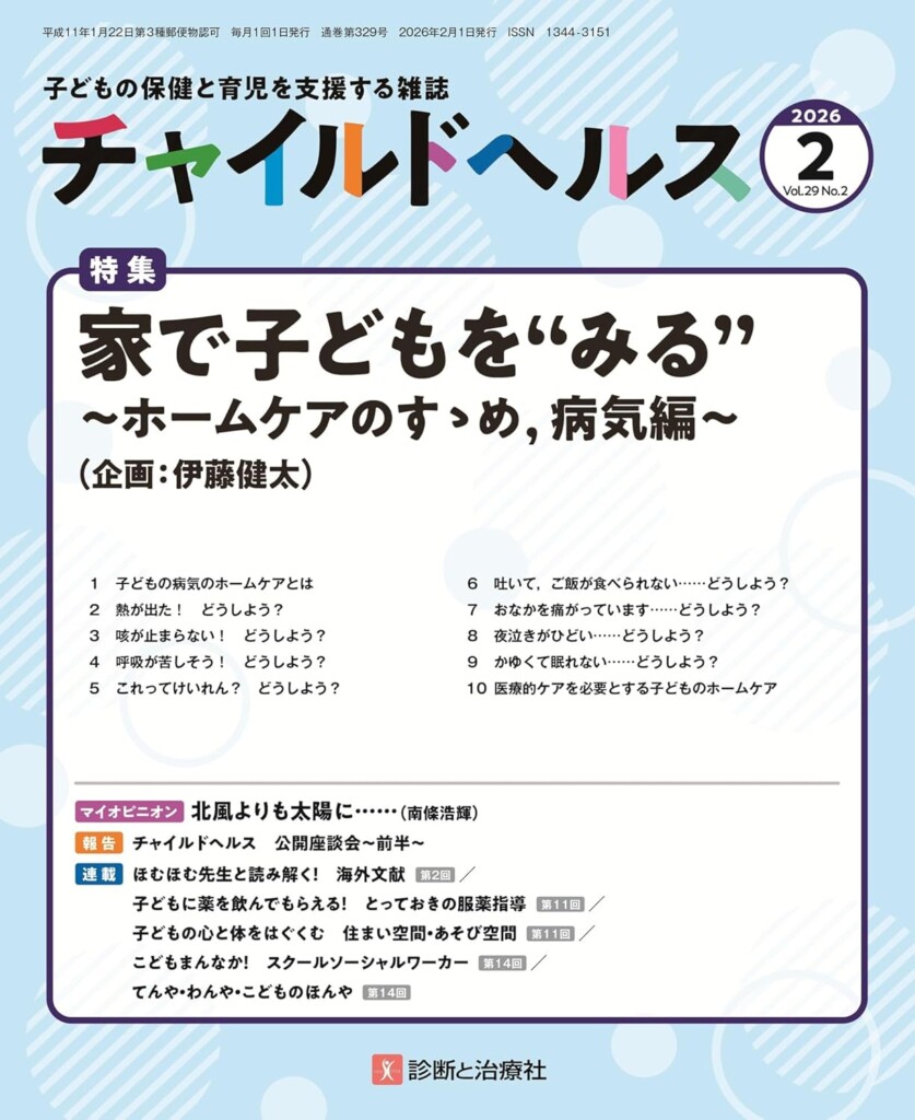 分担執筆「子どもの病気のホームケアとは」チャイルドヘルス 2026年 2月号 [雑誌] 特集「家で子どもを“みる”~ホームケアのすゝめ, 病気編~」2026年2月10日